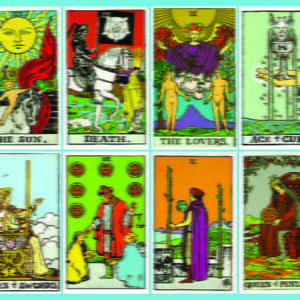 Pamela Colman Smith’s artwork was enhanced with vibrant colors by Frankie Albano. The deck was originally published in 1968 and went out of print just a few years later. There was sufficient demand for this deck so U.S. Games Systems re-issued a reproduction deck from the original in 1991 and it has remained a staple for tarot collectors since. The colors are bright with lots of purples and greens, which helps readers focus on details they might have otherwise missed. The background of the Minor Arcana is color-coded. The Cups feature light blue-green, the Wands are orange, the Pentacles lime green, and the Swords yellow. This is a vivid deck that appeals to those nostalgic for the psychedelic sixties or who appreciate the “wow” factor.