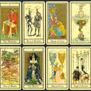 Italian artist Luigi Scapini’s lavish paintings recreate 15th century Italy in this gold-accented tarot deck. The Major Arcana and court cards have gold backgrounds in the manner of fifteenth-century European decks. Both the Major and Minor Arcana include full scenes. In the Minors, symmetrical arrangements of the suit symbols provide composition around which the scenes are arranged.The depth of Scapini’s art history expertise is evident in his lush settings and period costumes. Interesting details and sometimes-humorous references are cleverly embedded in the artwork, with many of the cards depicting historical figures, for example, Rasputin as the Knight of Cups. Readers will easily relate to the universal situations revealed in the cards, for pleasurable and insightful readings.