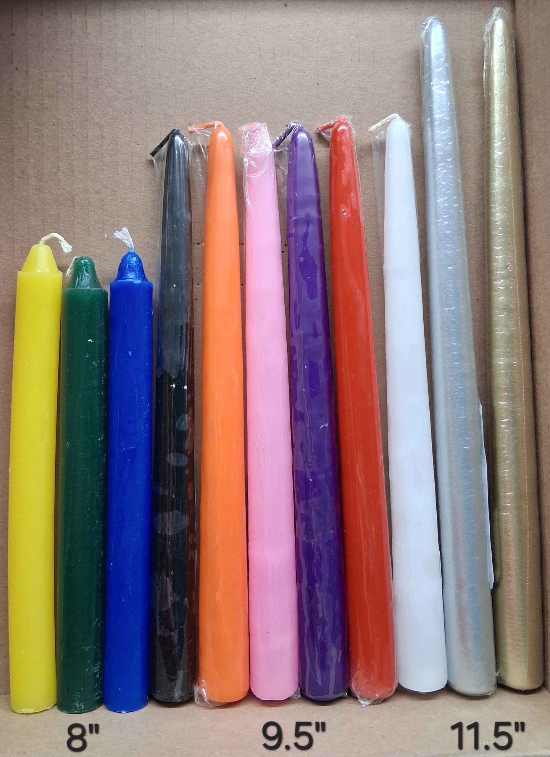 | Taper Candles | Black, Blue, Gold, Green, Orange, Pink, Purple, Red, Silver, White, Yellow |